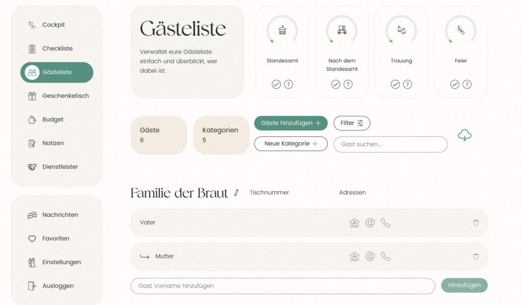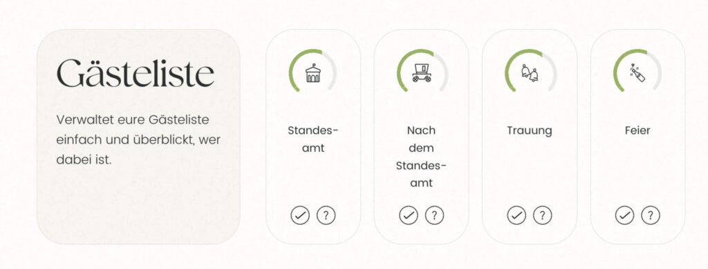 Das Tool zeigt euch automatisch, wie viele Gäste ihr aktuell für welchen Bereich eingeplant habt. Damit wird die Planung eurer Hochzeitsgesellschaft nicht nur einfacher, sondern endlich übersichtlich.