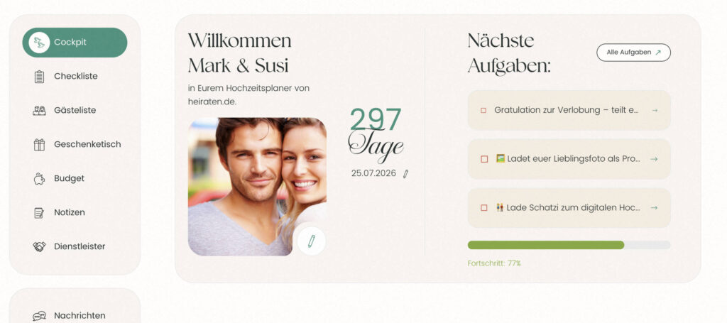 Viele Paare sagen: „Seit wir die Checkliste nutzen, fühlen wir uns zum ersten Mal wirklich organisiert.“ Sie ersetzt zehn verschiedene Apps – und spart euch jede Menge Nerven.