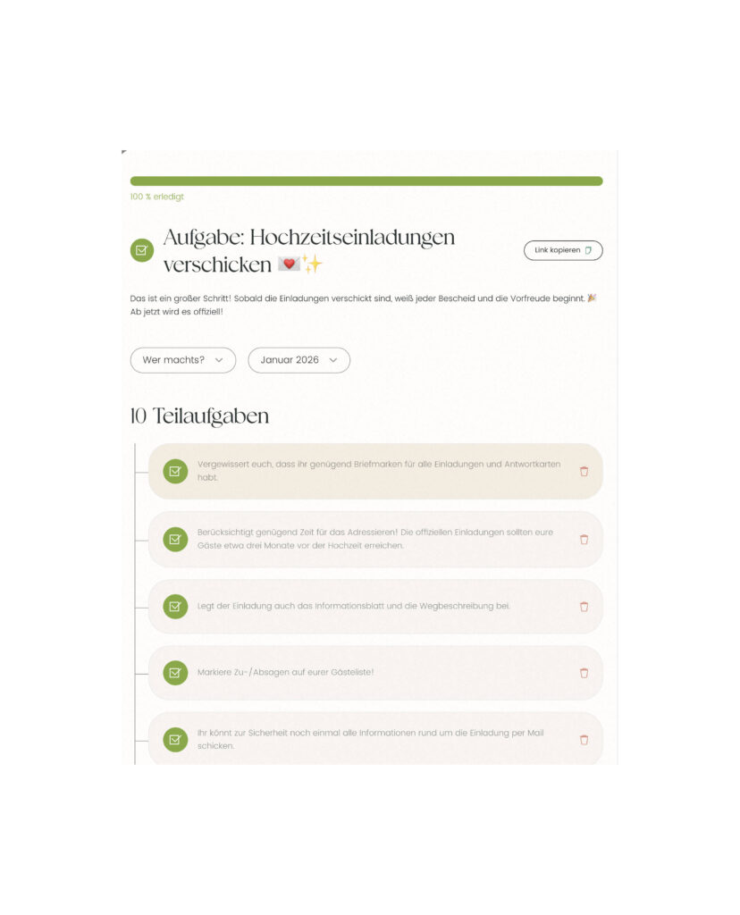Ihr könnt Aufgaben gezielt zuweisen, z. B. „Floristik besprechen“ an deine Mama oder „Getränkeliste checken“ an deinen Trauzeugen. Jeder sieht, was zu tun ist – und du siehst, was erledigt wurde. Ganz ohne WhatsApp-Chaos oder endlose Mails.