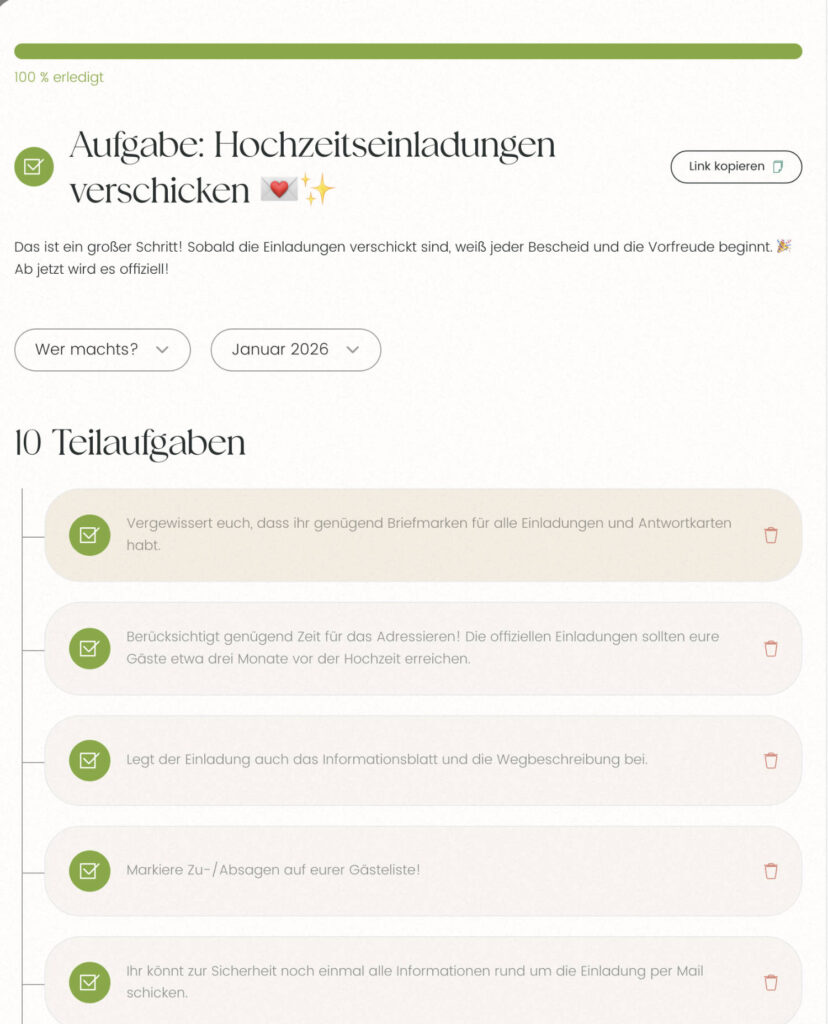So wird aus Chaos endlich Übersicht. Und aus eurer Planung ein echter Team-Moment. Klickt euch durch die Themenwelten und entdeckt, wie entspannt Hochzeitsvorbereitung sein kann – mit Struktur, Herz und den richtigen Infos zur richtigen Zeit.