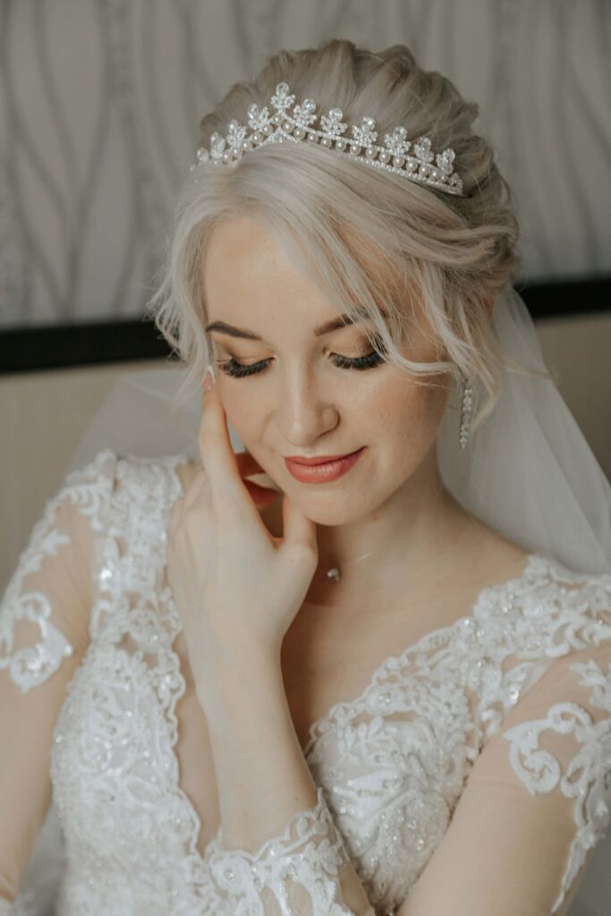 Eine Kopfbedeckung muss nicht nur zum Kleid, sondern auch zu Deiner Brautfrisur passen. Bei langen Haaren, die Du etwa hochstecken möchtest, kann der Schleier am Hinterkopf befestigt werden, während ein Diadem oder ein Fascinator an der Seite für Glamour sorgen. Kurzhaarige Bräute profitieren von der Vielseitigkeit von Hüten, Haarreifen oder Fascinatoren, die sich leicht mit Nadeln fixieren lassen. Sprich vor Deiner Hochzeit mit Deinem Stylisten und probiere verschiedene Varianten aus. Ein Testlauf sichert Dir, dass am großen Tag nichts verrutscht und Dein Look auch beim Tanzen, Umarmen und Lachen hält.