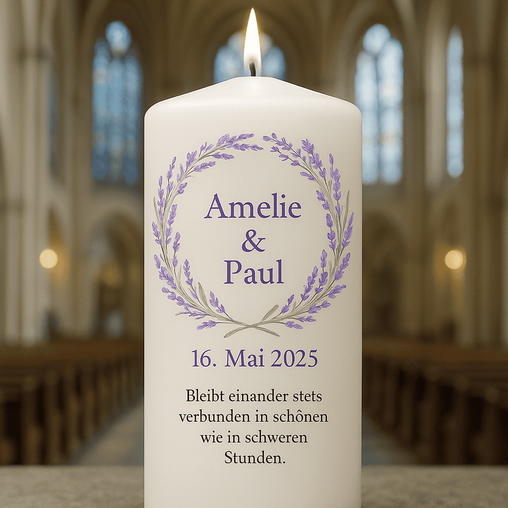 Extra-Tipp: Wenn ihr eine thematische Hochzeit plant, könnt ihr die Kerze an euer Motto anpassen. Für eine Vintage-Hochzeit bieten sich Spitzenbänder und Pastellfarben an, während eine moderne Feier von klaren Linien und minimalistischen Designs profitiert.