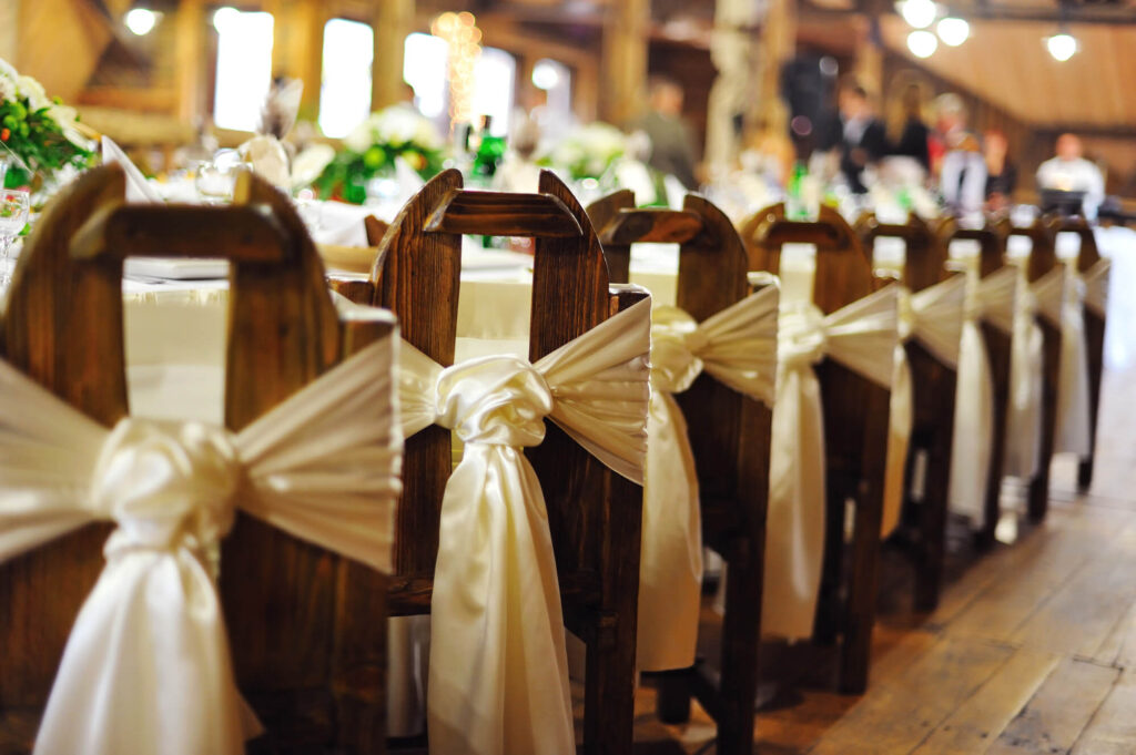 Themenbezogene Stühle: Dekoriere die Stühle mit Blumen, Schleifen oder thematischen Elementen, die zur Hochzeit passen.